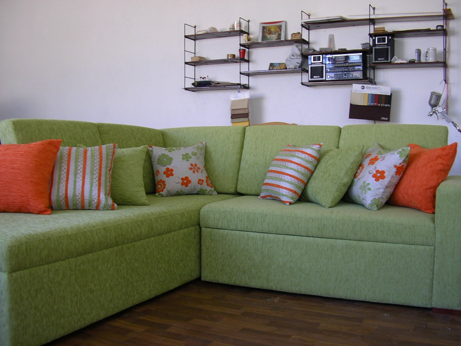 Ъглова холна гарнитура изработена по поръчка с материали на клиента.Едната част на дивана е с разтегателен механизъм за спане.Възглавниците са подвижни,събличащи се с цип за по-лесно сваляне на калъфите и пране.